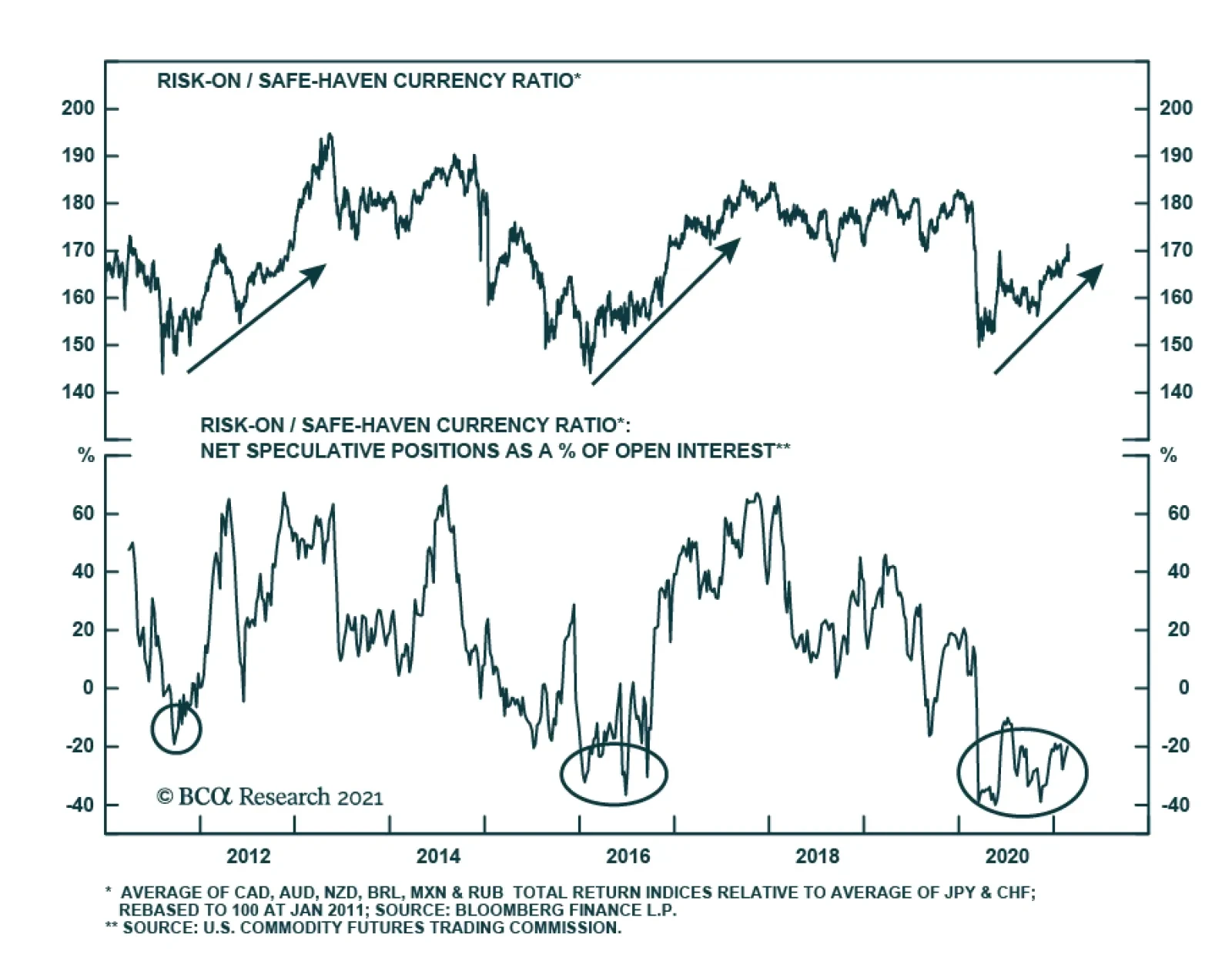 Cyclical currencies, captured by a basket of the CAD, AUD, NZD, BRL, MXN, and RUB have fared well since the beginning of the year, outperforming their defensive peers. A ratio of these “risk-on” currencies versus the JPY and CHF is up 2.43% year-to-date. …