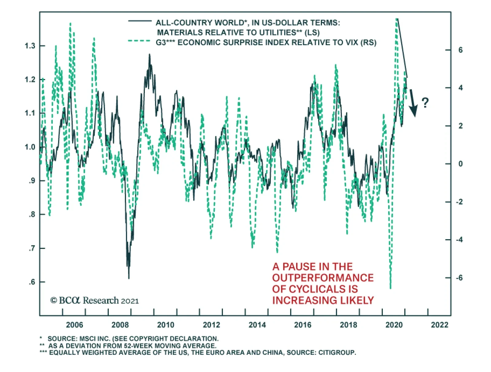 Buying cyclical equities at the expense of defensives has been all the rage over the past nine months. This trend has been supported by ample liquidity conditions, supportive fiscal policy, improving economic surprises and falling volatility (as measured by…
