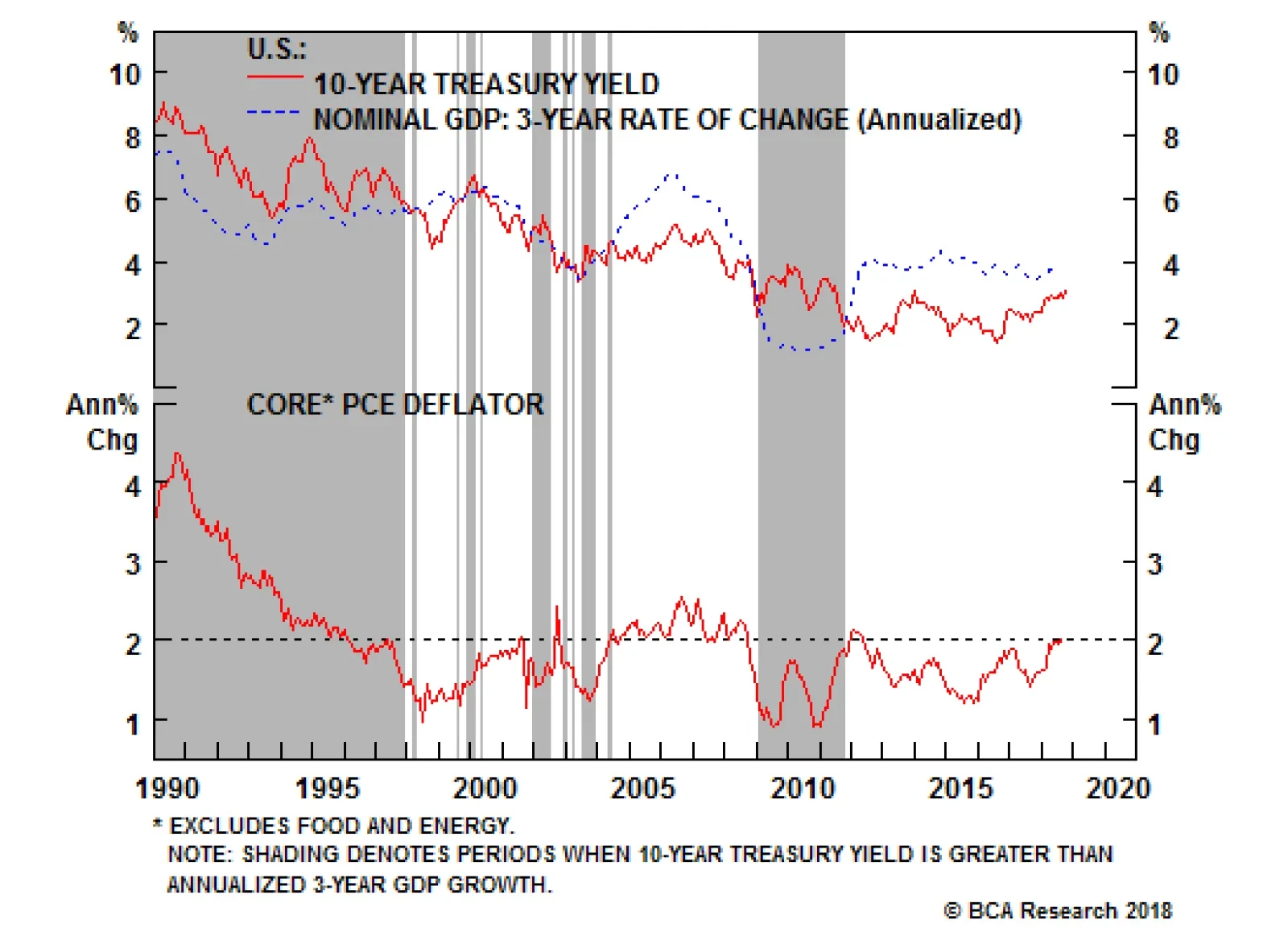 Nominal GDP Historically, a 10-year Treasury yield above the nominal GDP growth has coincided with downward pressure on core inflation, signals that we are approaching the end of the cycle, and therefore a rising likelihood of recession and bear market. …