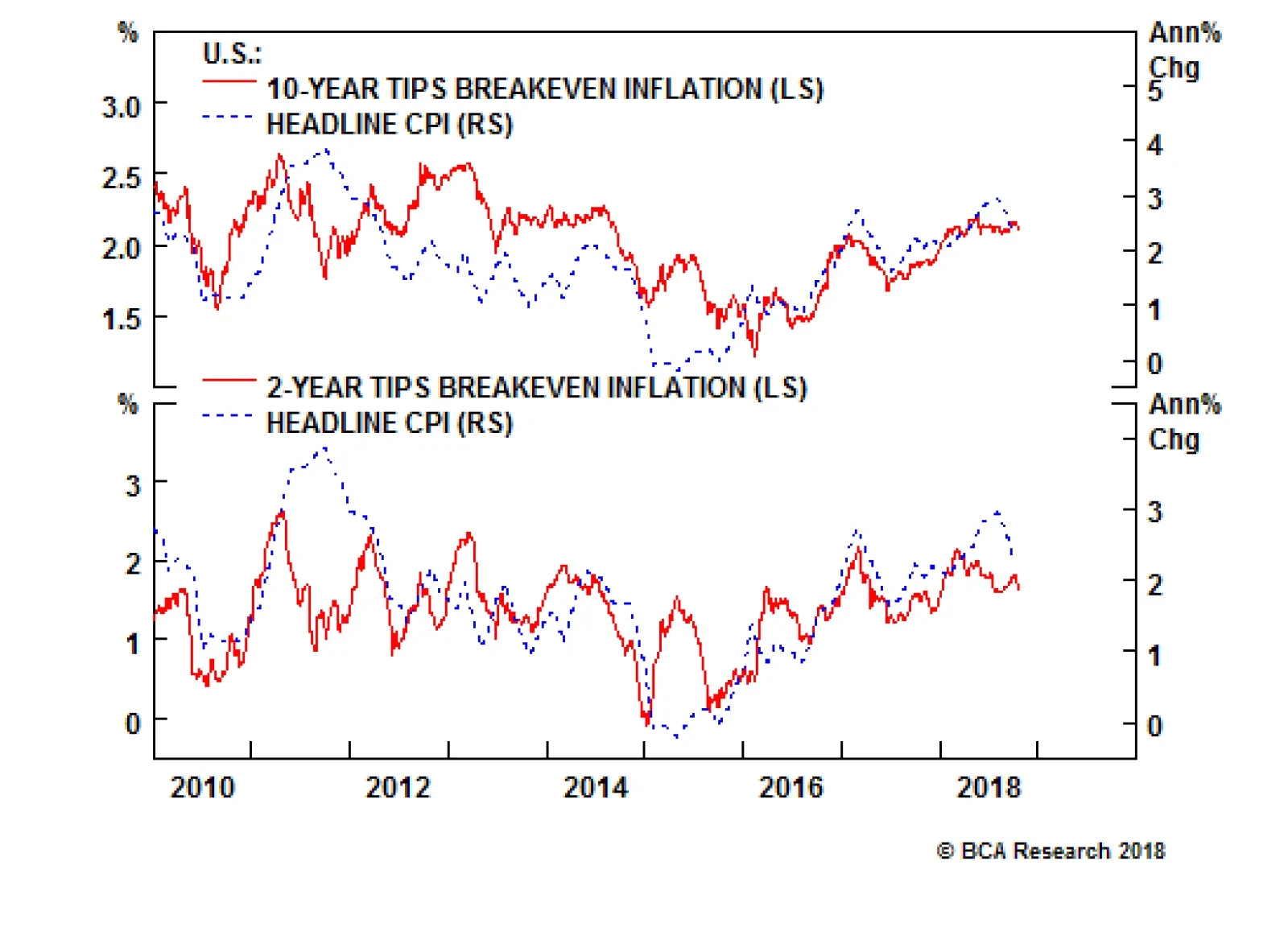 We cannot completely rule out the possibility that stronger productivity growth actually causes unit labor costs to decelerate even as "top line" wage pressures mount. Unit labor costs are essentially the ratio of wages (compensation per hour) to productivity (output-per-hour), and the bottom panel of Chart 5 shows that a deceleration in unit labor costs could cause the yield curve to steepen. However, we note that there is not much precedent for strong productivity growth overwhelming an acceleration in wages, causing unit labor costs to diverge from other wage measures. For example, even as productivity growth strengthened in the 1990s, unit labor costs continued to rise alongside other measures of wage growth. Inflation Expectations We have frequently noted that inflation expectations embedded in long-dated Treasury yields remain too low compared to levels that are consistent with inflation being well-anchored around the Fed's 2% target. It stands to reason that long-maturity TIPS breakeven inflation rates could steepen the yield curve as they adjust higher. However, the 10-year TIPS breakeven inflation rate is currently 2.11%, only slightly below the range of 2.3% to 2.5% that has historically been consistent with well-anchored inflation expectations (Chart 6). In other words, the upside in long-dated breakevens is now fairly limited. In contrast, the 2-year TIPS breakeven inflation rate stands at only 1.70%, still considerably below "well-anchored" levels (Chart 6, bottom panel). Chart 6More Upside In Short-Dated Breakevens