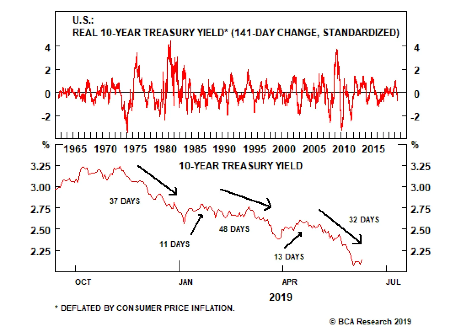 Highlights Bond yields have fallen a lot since the beginning of November, … : At the close on November 8th, the 10-year Treasury bond yielded 3.24%. By last Monday, it was yielding just 2.07%. … but the move isn’t terribly anomalous relative to history: In terms of nominal yields, the decline was just over a one-standard-deviation event; per real yields, it amounted to a -0.7 sigma move. The Fed may be preparing for a rate cut, but overweight duration positions will only pay off if several more follow: A one-and-done rate cut would stretch out the expansion and the bull markets in equities and spread product, but Treasuries are priced for an extended rate-cutting cycle. Feature Stocks are said to be the only asset that people want more of when prices rise, and less of when they fall. Lately, bonds have also seemed to have an upward-sloping demand curve, because more and more people have bought them as they’ve gotten more expensive. A BCA client who’s been shaking his head at the action got in touch with us last week to try to make some sense of it all. Experience tells him that big moves like the one that’s been unfolding since last November don’t go on forever. When they stop, mean reversion would suggest that they’re prone to retrace a good bit of territory. He came to us for some historical context to support or contradict his intuition, as summed up in something like the following statement. “Over the past 50 years, the current move equates to an x-standard-deviation event. Following similar instances, rates have risen by x basis points over the next six months, and by y basis points over the next twelve months.” The Empirical Record The sharp decline in the 10-year Treasury yield that began in early November can be viewed as three separate declines (Chart 1). In the first, the 10-year yield fell by 68 basis points (“bps”) over a span of 37 trading days. After retracing a third of the decline over the next 11 sessions, it slid by another 40 bps over 48 days. Following a one-half retracement over the ensuing 13 days, it shed 53 basis points in 32 days, capped off by a 36-bps decline across the final eight sessions (Table 1). Chart 1The Path To 2.07%