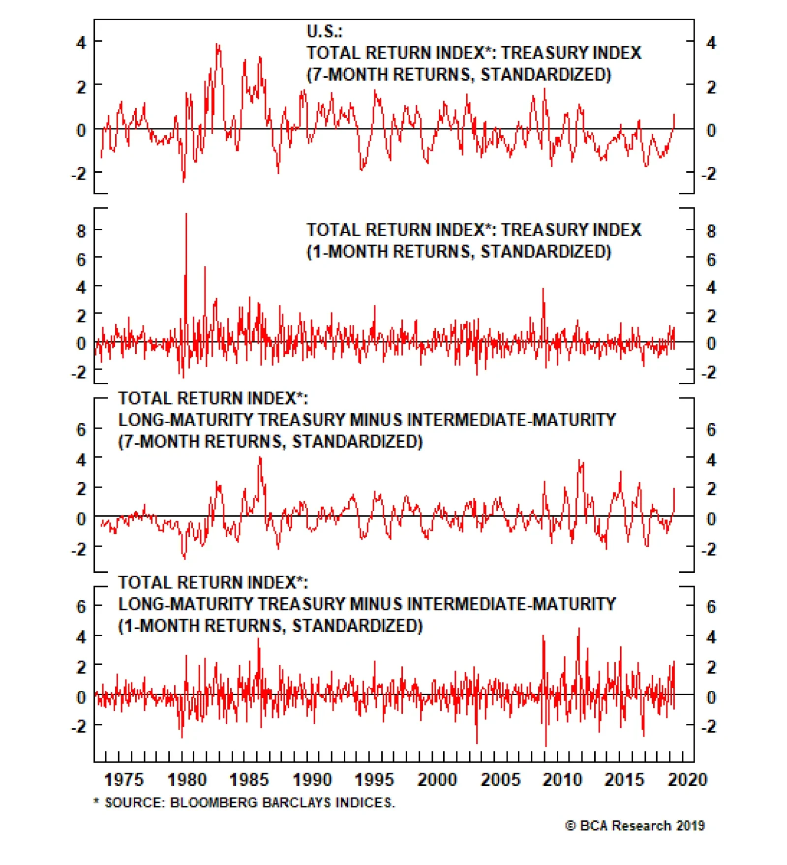 We are familiar with the electronic financial media’s increasingly popular convention of stating daily yield moves in proportion to the previous day’s closing yield.1 That convention has the advantage of fitting snugly aside stock price quotes on TV and computer screens, but it is ultimately nonsensical. The proportional change in a bond’s yield relative to its starting yield doesn’t come close to approximating the change in the value of that bond. Comparing proportional changes in bond yields across timeframes would be a way of putting today’s yield moves on a more equal footing with yield moves in the high-inflation, high-coupon era of the late seventies and early eighties, but it conveys no practical information. The margin by which long-maturity Treasuries have outperformed intermediate-maturity Treasuries is unusual, ... Our next steps were instead to compare Treasury total returns and the change in the slope of the yield curve to past flattening and steepening episodes. The moves here were also unavailing over both seven- and one-month periods, as the high-coupon ‘70s and ‘80s still dominated (Chart 4). In terms of the change in the 10-year Treasury yield, both nominal and real; Treasury index total returns; and the slope of the yield curve (3-month rate to 10-year yield), both the aggregate move since last October and its three component moves have amounted to one-standard-deviation events. They would only have had about a one-in-six chance of occurring randomly in a normally distributed population, but they do not represent unsustainable moves that cry out to be reversed. Chart 4Little Impact In Terms Of Treasury Total Returns, ...