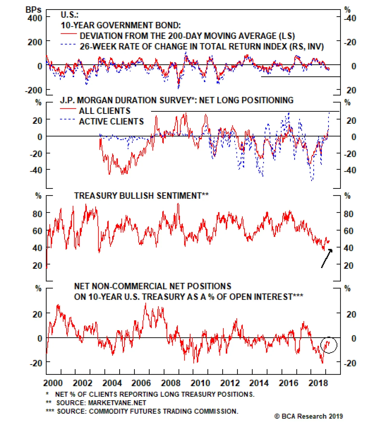 The U.S. data surprise index is deeply negative at present, and has been for several weeks. But the longer the data continue to disappoint, the more downbeat investor expectations become and the more likely it is that the surprise index will rise in the future. Right now, our simple auto-regressive model projects that the surprise index will be slightly higher in one month’s time, though still deeply negative. Nevertheless, the Surprise index suggests we are approaching a turning point in investor sentiment. Mix Well, Cover, Stir Occasionally We’ve now presented what, in our view, is a fairly complete list of factors that should be included in a macroeconomic model of the 10-year Treasury yield. Importantly, each factor complements the other ones in the sense that they each capture a different element of the economic landscape. At this stage, it would be nice to weight all of the factors together and arrive at a fair value estimate for the 10-year yield. Unfortunately, we won’t be performing that exercise in this report (we may do so in the future). The key challenge in combining all of the indicators together is that the sensitivity of the 10-year yield to each of the above factors changes over time. For example, there are periods when policy uncertainty appears to be a very significant driver of the 10-year yield, and other times when it appears to not matter much at all. The macro indicators listed in this report generally signal that the 10-year yield is near its trough. While it is often useful to boil all of the important drivers down into a point estimate of the 10-year yield, such an exercise can also create problems if it causes us to zero-in on the model’s output and avoid thinking critically about what the different macro inputs are telling us. As of today, we think the macro indicators listed above generally signal that the 10-year yield is near its trough. Leading global growth indicators have hooked up, suggesting that the Global Manufacturing PMI will improve during the next few months and that bullish dollar sentiment could soften. Survey indicators suggest that the labor market remains tight, and that wage growth will stay in an uptrend. Policy uncertainty will probably continue to apply some downward pressure to yields, but a long Brexit extension and/or trade agreement between the U.S. and China could cause that impact to wane in the next few months. Economic sentiment is likely quite depressed, meaning that the bar for positive surprises is low. All in all, our investment strategy is unchanged. We recommend that investors maintain below-benchmark duration in U.S. bond portfolios, while focusing short positions on the 5-year and 7-year maturities. Ryan Swift, U.S. Bond Strategist rswift@bcaresearch.com Footnotes 1 The rationale for tracking the CRB/Gold ratio can be found in U.S. Bond Strategy Weekly Report, “The Search For Aaa Spread”, dated March 12, 2019, available at usbs.bcaresearch.com 2 www.policyuncertainty.com 3 Please see Global Investment Strategy Quarterly Outlook, “From Dead Zone To End Zone”, dated March 29, 2019, available at gis.bcaresearch.com 4 Please see U.S. Bond Strategy Weekly Report, “How Much Higher For Yields?”, dated October 31, 2017, available at usbs.bcaresearch.com Fixed Income Sector Performance Recommended Portfolio Specification