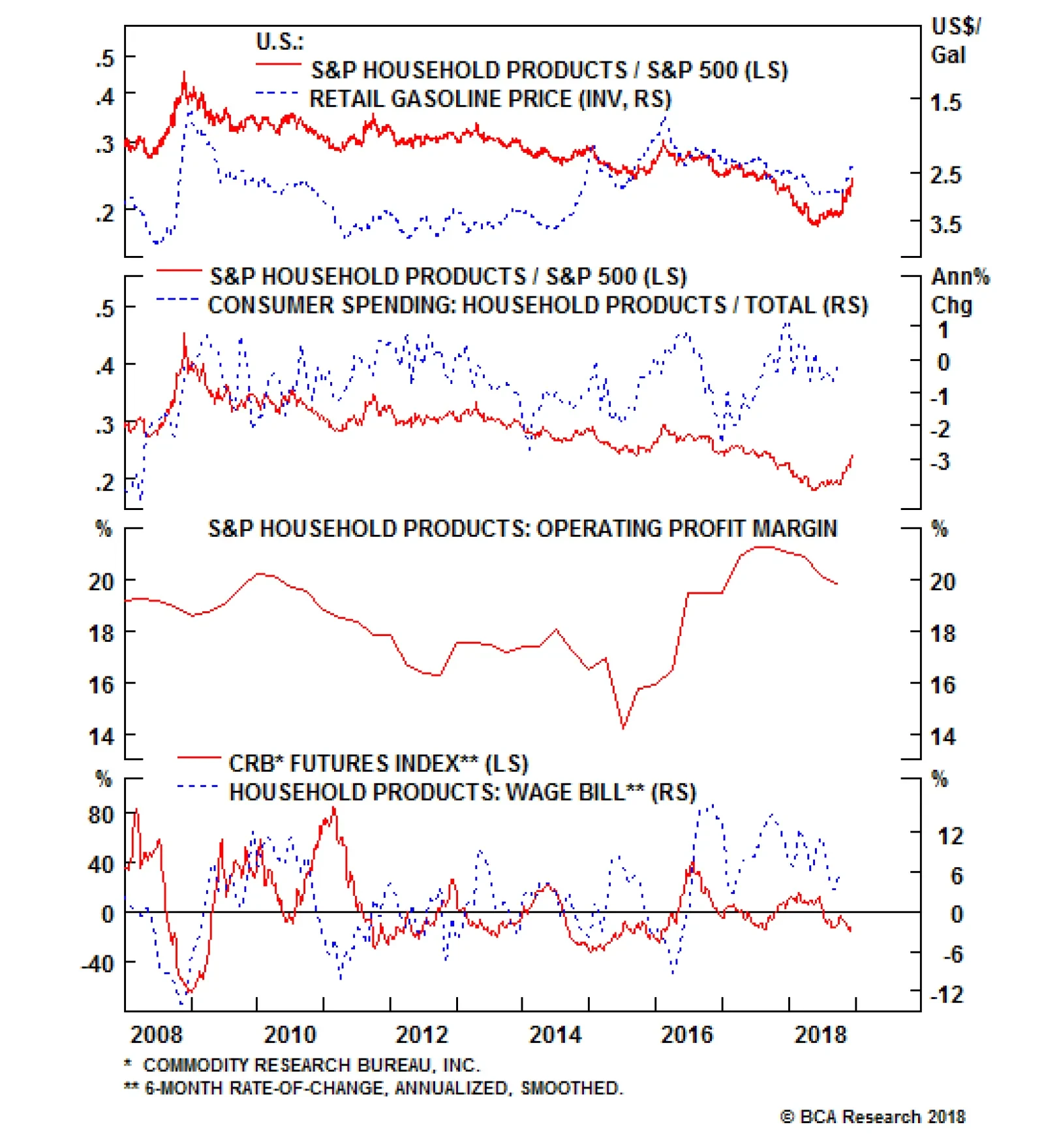 Overweight Household product stocks have typically performed well as retail gasoline prices have contracted; this iteration has proven no different (gasoline prices shown inverted, top panel). This boon to consumers has…