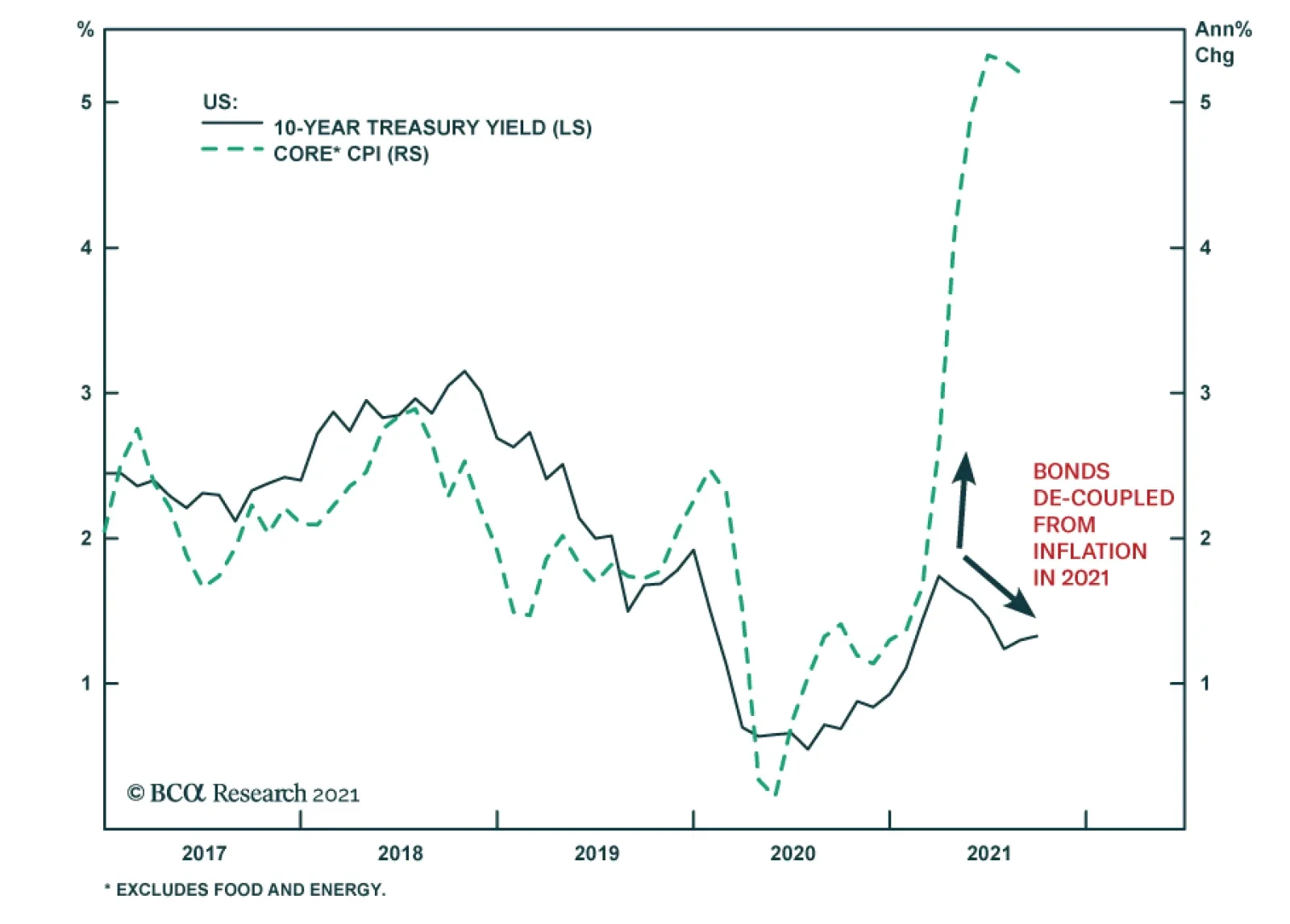 Highlights Fed: The Fed will be forced to clarify its definition of “maximum employment” in 2022, and the path of inflation will ultimately dictate how far the Fed tries to push the labor market. We expect Fed rate hikes to start in December 2022 and that the pace of hikes will proceed more quickly than is currently priced in the yield curve. Duration: Investors should maintain below-benchmark portfolio duration in anticipation of a rate hike cycle starting in December 2022. Yield Curve: Investors should position in Treasury curve flatteners. Specifically, we recommend shorting the 5-year Treasury note versus a duration-matched barbell consisting of the 2-year and 10-year notes. Feature Chart 1Bonds De-Coupled From Inflation In 2021