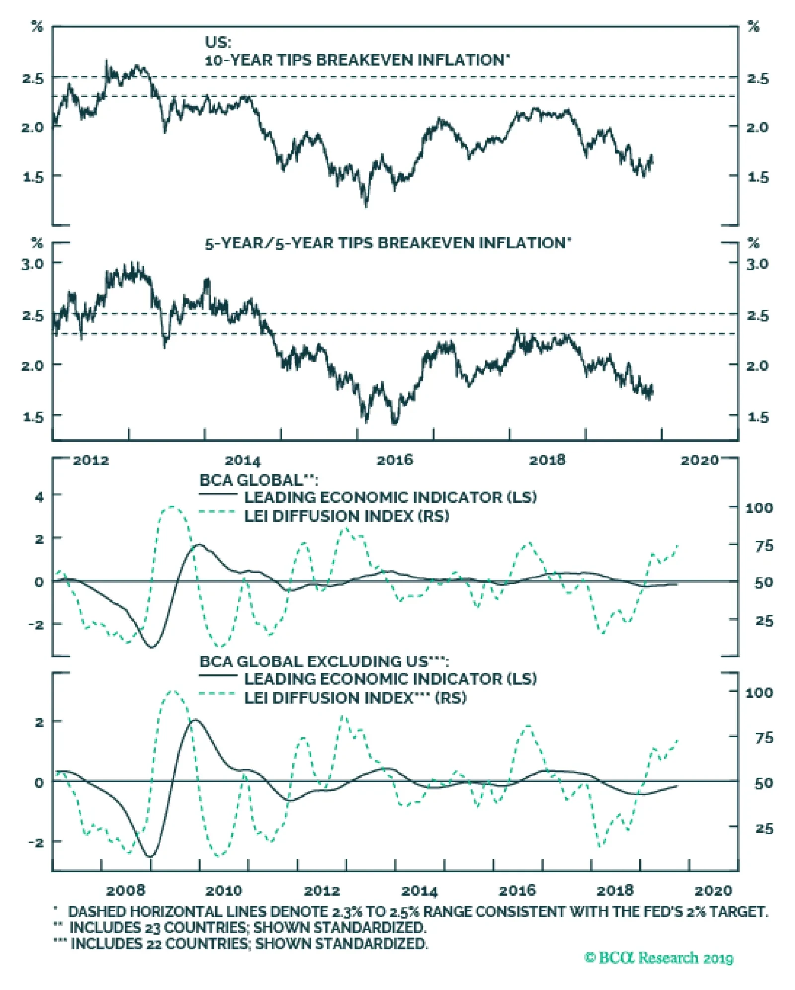 Highlights There is little risk that inflation will heat up over the next several months, … : Weak growth is more of a threat to the global economy than inflation. … which means the Fed won’t be in any hurry to take away this year’s rate cuts, … : We expect the Fed to leave the target fed funds rate alone for nearly all of 2020. … giving the economy plenty of opportunity to overheat: If trade tensions move to the back burner, and global manufacturing activity revives, the “insurance” rate cuts executed by the Fed and other central banks may turn out to have been unnecessary. The investment punch line is that accommodative monetary policy is likely to push asset prices and Treasury yields higher: Our revised Rates View Checklist supports going back to a below-benchmark duration stance over the tactical timeframe, in line with our cyclical view. Feature BCA researchers’ latest monthly view meeting opened with a discussion of whether inflation or deflation is the bigger risk to financial markets. Should investors be more concerned about signs of overheating or stalling growth? With inflation unable to get traction in any of the major economies, we all agreed that growth is the more critical unknown. An investor who gets the growth call right has the best chance of getting broad asset class positioning right, along with country, sector, duration, credit and currency tilts. While we continue to believe that there are more inflation pressures beneath the surface of the US economy than most investors realize, they are highly unlikely to manifest themselves any time soon. At today’s low-single-digit levels, inflation’s investment import is limited to its impact on monetary policy. Inflation expectations remain far below the levels that are consistent with the Fed’s inflation target (Chart 1), and the Fed is likely to keep policy easy until they adjust higher. Though it is uncertain just what levels of realized inflation, or inflation expectations, would trigger the Fed’s reaction function, we are confident that inflation will not be an issue in the coming year. Chart 1No Pressure To Remove Accommodation