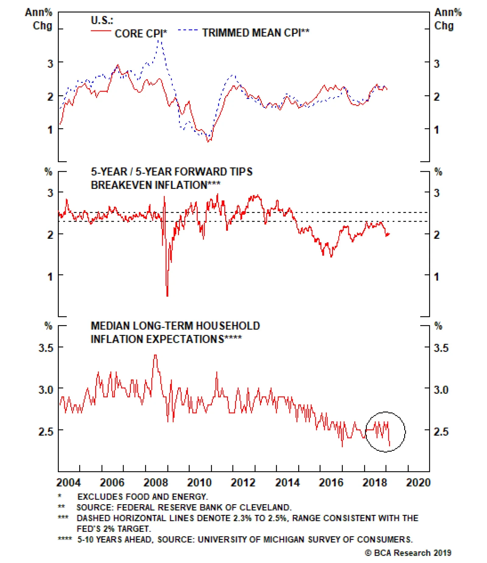 Don’t Fence Me In Q: [B]elow-target inflation is a … phenomenon … across advanced economies, and I’d … like to … hear your thoughts about what kind of challenges that poses to policy makers like yourself and the global economy in general. Chair Powell: It’s a major challenge. It’s one of the major challenges of our time, really, to have … downward pressure on inflation[.] It gives central banks less room … to respond to downturns[.] [I]f inflation expectations are below two percent, they’re always going to be pulling inflation down, and we’re going to be paddling upstream and trying to … keep inflation at two percent, which gives us some room to cut, … when it’s time to cut rates when the economy weakens. … It’s … one of the things we’re looking into as part of our strategic monetary policy review this year. The proximity to the zero lower bound calls for more creative thinking about ways we can … uphold the credibility of our inflation target, and … we’re open-minded about ways we can do that. Our best guess is that the Fed has become frustrated by moribund inflation expectations ten years into a recovery. Now that it sees the potential for a recession in the not-so-distant future, it would prefer not to have to confront it with the zero lower interest-rate bound tying one hand behind its back. It would be reasonable if it would also prefer not to have to rely too heavily on asset purchases, given all the headaches that even a modest shrinking of the balance sheet has occasioned. The Fed’s ongoing monetary policy review may therefore turn out to be more than an academic exercise. It might be awfully nice to have strategies aiming to reverse past misses of the inflation objective in place before the next recession arrives. Those strategies would provide the Fed with more flexibility to reduce real interest rates via moves in the fed funds rate. Powell discussed the potential appeal of these sorts of strategies at Stanford University just a week and a half before the FOMC meeting,4 and despite all the times they’ve been bandied about, they just might come to something this time around. Investment Implications The Fed has made a significant pivot since October’s “long way from neutral,” and December’s post-FOMC press conference, when the chair seemed to be disconnected from the markets’ agita. We don’t think a 2019 rate hike is completely out of the question, but there is no doubt that the Fed’s reaction function has changed. We don’t yet see a reason to revise our terminal rate estimate down from 3.25%-3.5%, even if it’s evident that it will take a good bit longer for the Fed to get there than we initially expected. It seems to be more willing to let inflation get ahead of it – it may end up actively encouraging inflation to do so – before it completes its meandering journey to the terminal rate. Allowing the economy to run a little hotter should be equity-friendly. It’s hard to get earnings contraction without a recession, and recessions don’t occur when monetary policy is accommodative. If the Fed requires more evidence of improvement before it resumes hiking rates, the economy and corporate earnings should be able to build up more momentum than they otherwise would. The Fed’s newfound patience should also be spread-product-friendly, as borrowers become better credits as an expansion rolls along. The Treasury outlook is more nuanced. Yields fell as the Fed committed to remaining on hold for longer, but the Fed now seems to have exhausted its capacity for dovish surprises. Short of a recession or near-recession, it’s hard to see how yields can go much lower. Given markets’ seeming conviction that inflation is as dead as a doornail, however, Treasury bond yields may do no more than drift higher at the margin until the Fed’s efforts to put a floor underneath inflation expectations begin to bear some fruit. We still think risk-friendly positioning makes sense, and we reiterate our equity and spread-product overweights, our Treasuries underweight, and our below-benchmark-duration recommendation. Doug Peta, CFA Chief U.S. Investment Strategist dougp@bcaresearch.com Footnotes 1 At the other end of the spectrum, the unemployment rate fell two ticks in February, to 3.8%, despite a meager net increase of 20,000 jobs. Short-term disconnects can be explained by the fact that the unemployment rate (household) and net payrolls additions (business establishments) are calculated from separate surveys, but no one knows exactly how many people who aren’t working are available to work when they decide the time is ripe. 2 Please see the February 26, 2019 U.S. Investment Strategy Special Report, “The Phillips Curve: Science Or Superstition?” Available at usis.bcaresearch.com. 3 The Fed may not care a whit about the yield curve, but may simply want to hold its fire until it is convinced that the economy requires less accommodation so as not to overheat, which would get it to the same place: not hiking until long yields begin to price in the potential for overheating. 4 Please see the March 18, 2019 U.S. Investment Strategy Weekly Report, “Kinder, Gentler Central Banking.” Available at usis.bcaresearch.com.