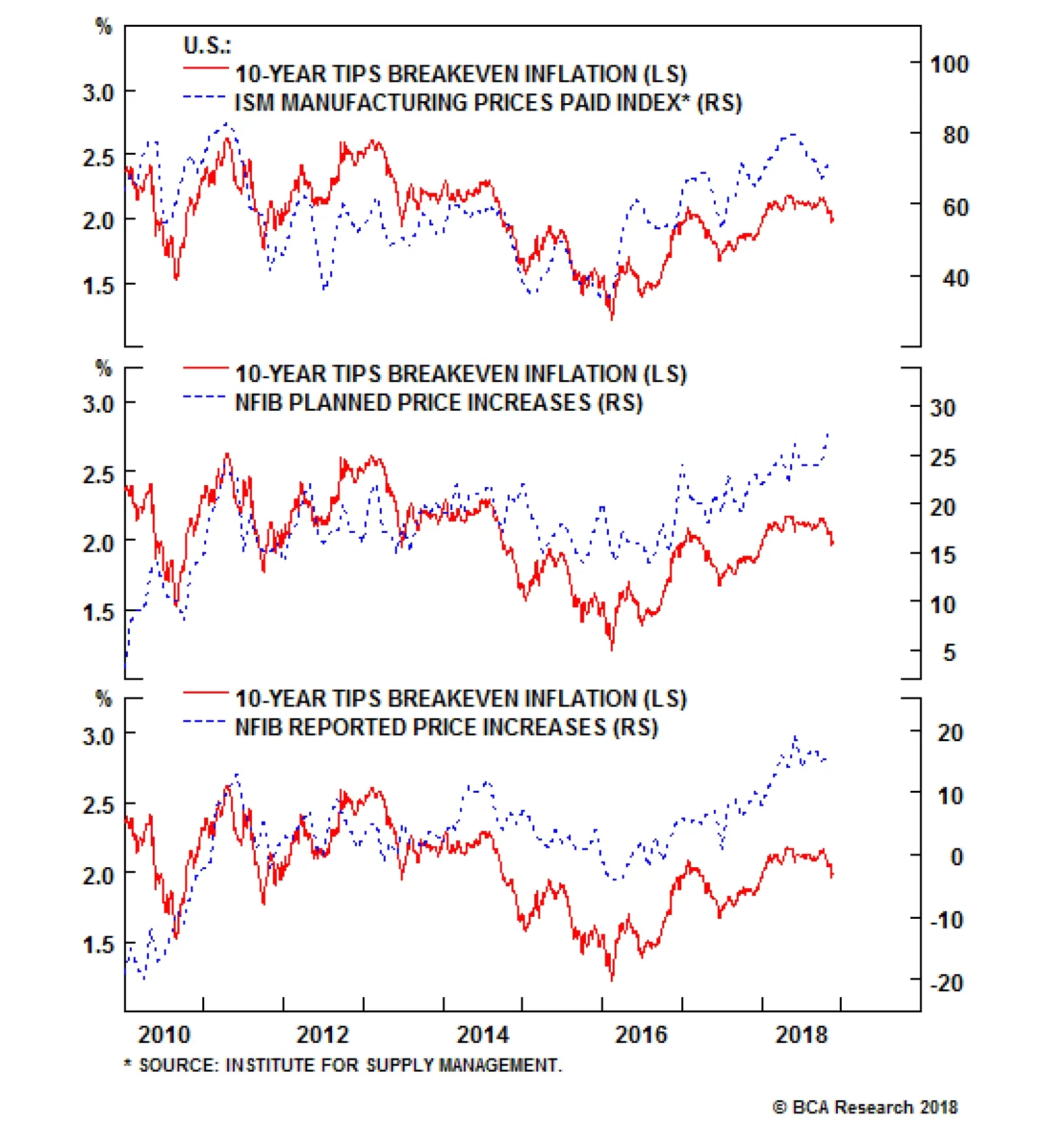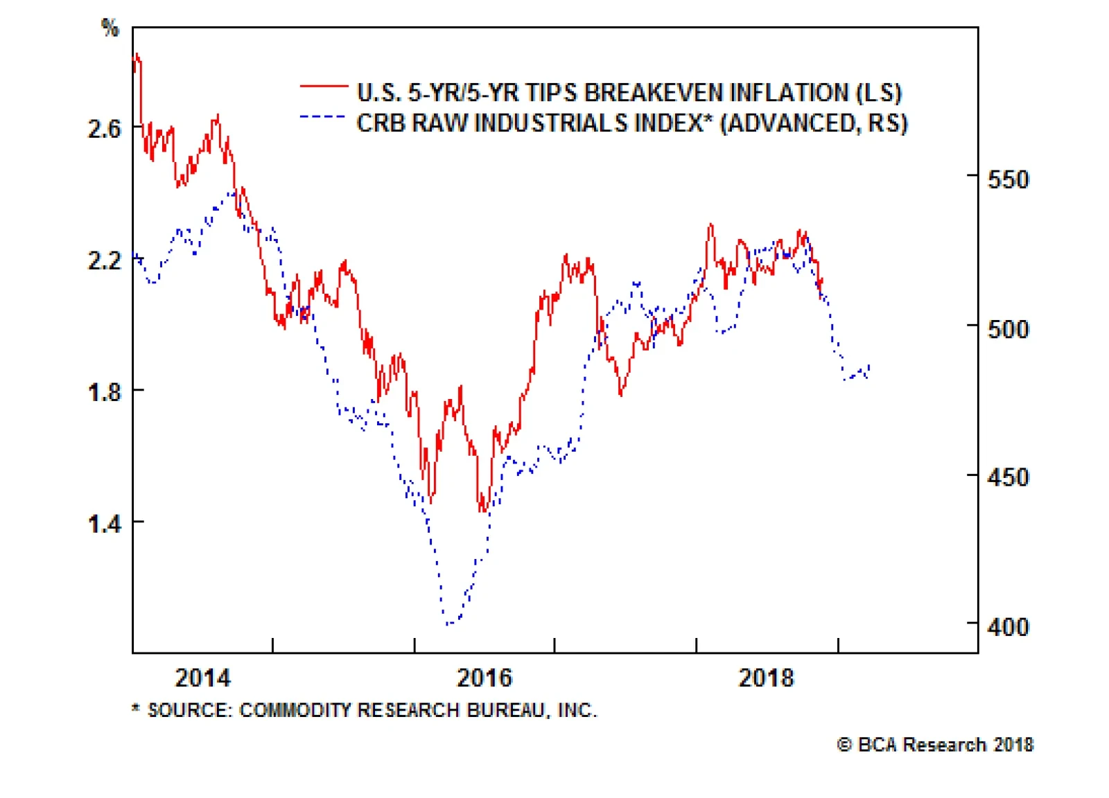 Bottom Line: U.S. economic growth will decelerate from a high level during the next few quarters, but the Fed will need to see further significant tightening in broad indexes of financial conditions before backing away from its +25 bps per quarter rate hike pace. Investors should get more defensive on credit spreads, but maintain below-benchmark duration. Stick With TIPS We have been recommending overweight positions in TIPS versus nominal Treasuries for some time, targeting a range of 2.3% to 2.5% for both the 10-year and 5-year/5-year forward TIPS breakeven inflation rates. This range is consistent with prior periods when core inflation was well-anchored around the Fed's target.2 This recommendation suffered a set-back last week when long-maturity breakevens finally capitulated to the trend in other financial market indicators that have been pointing to weakness in global demand for several months (Chart 4). In fact, for most of this year falling commodity prices and a strengthening dollar have been signaling that global demand is on the decline. But until last week, TIPS breakevens had mostly bucked the trend. Chart 4Held Down By Global Demand