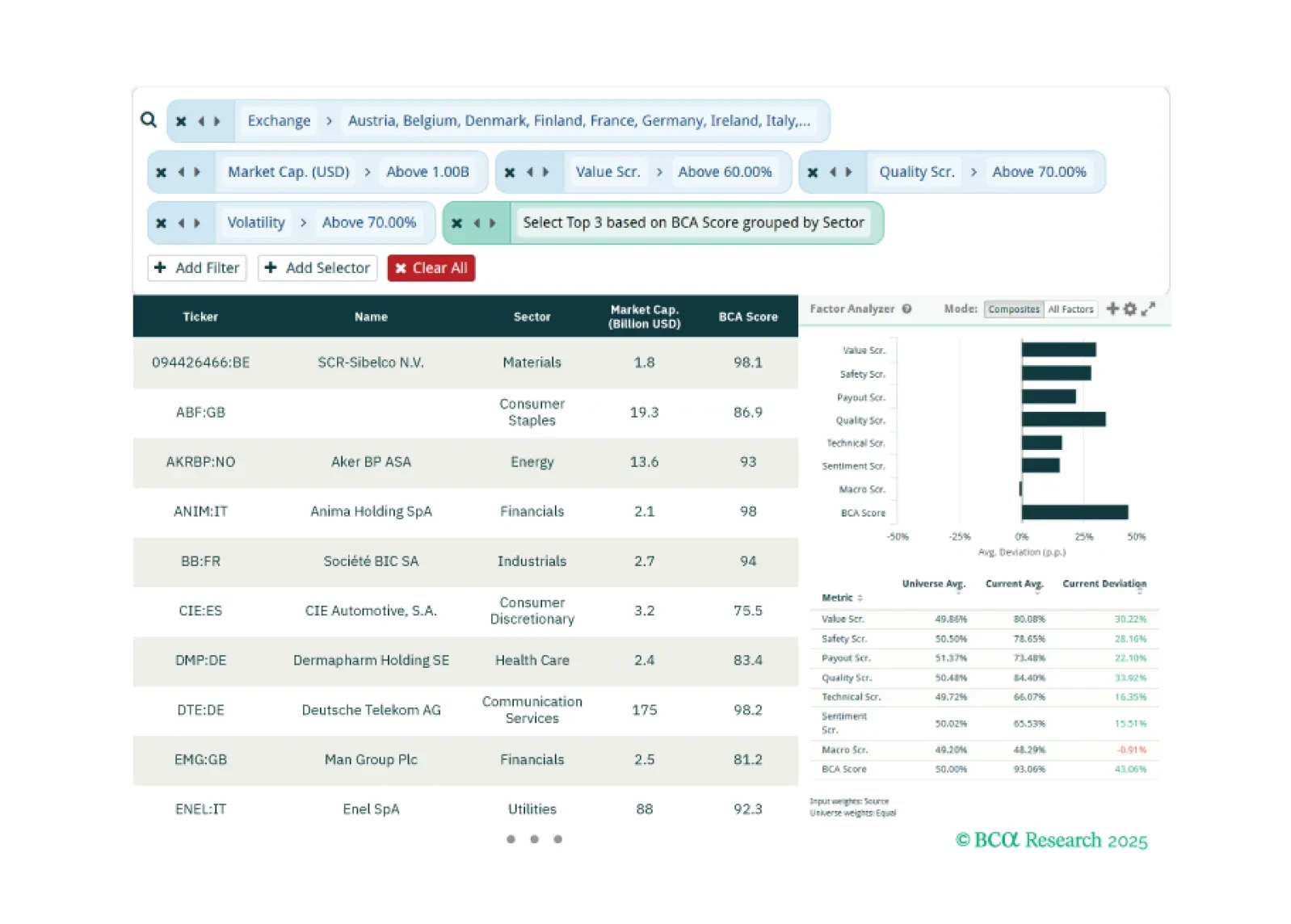 This week, our three screeners cover: Favoring European equities over US equities, cybersecurity stocks, and large caps with large moves in their BCA Score.