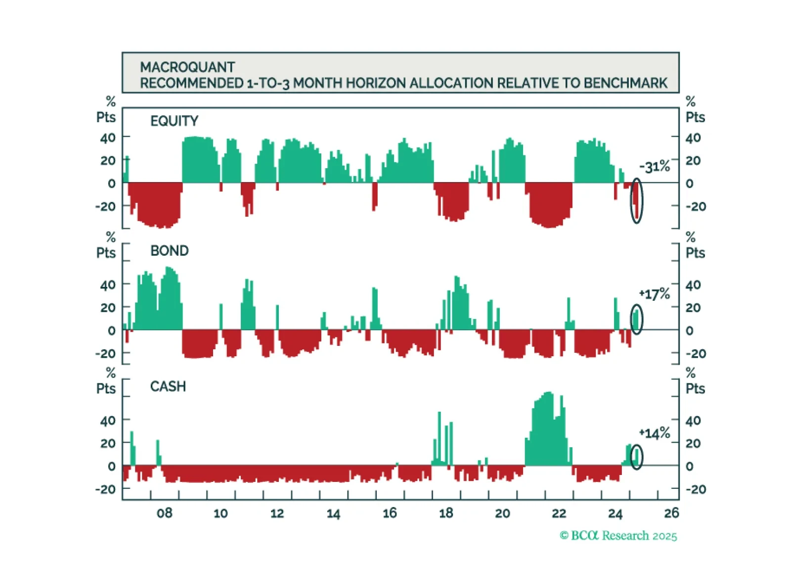 MacroQuant warns that US equities are pricing in very little economic risk. The model is shunning equities and recommends a large overweight to cash.