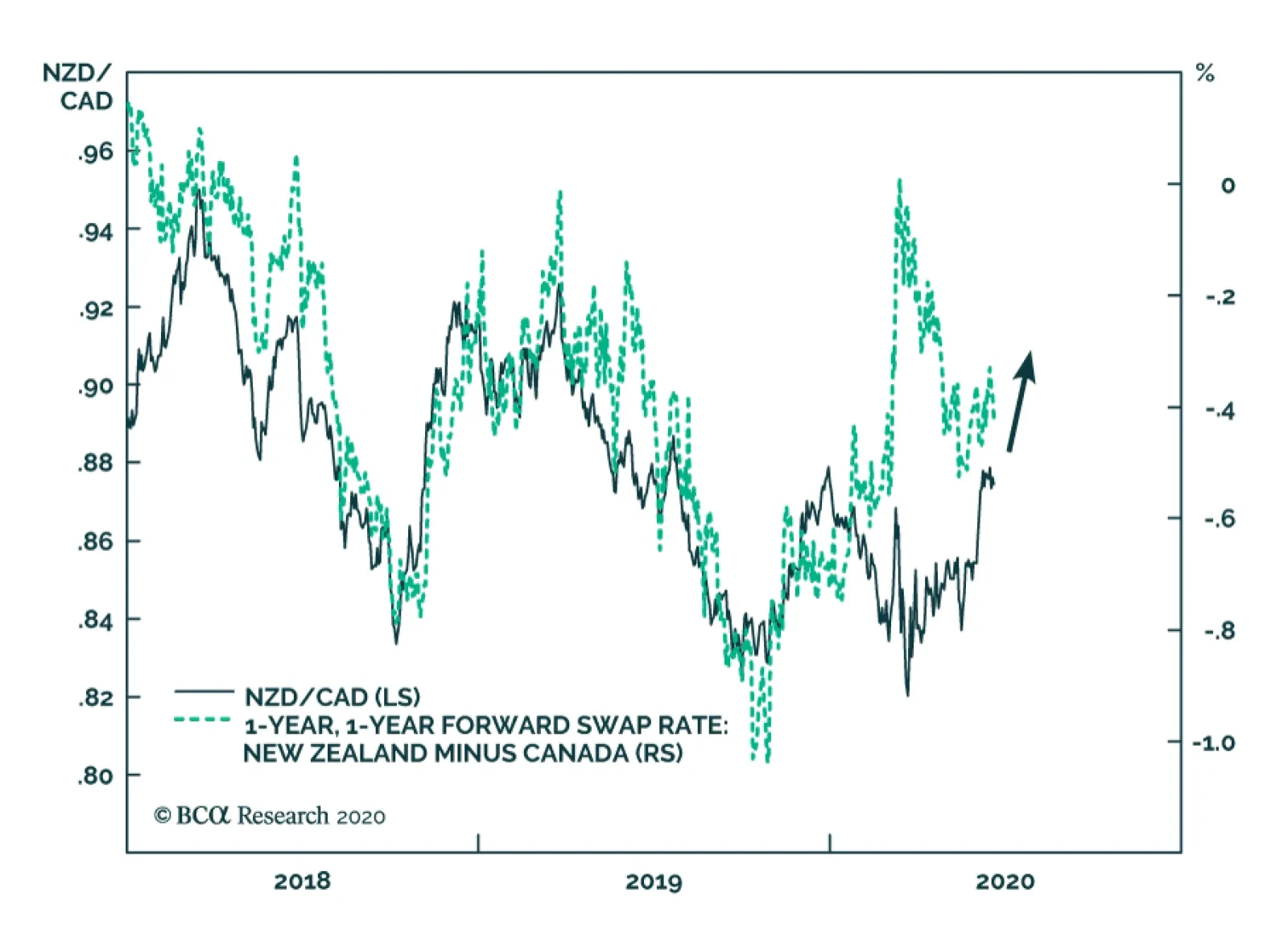 NZD/CAD is likely to appreciate over the coming six to nine months. For the past two and a half years, the NZD/CAD cross has closely followed the 1-year/1-year forward swap rate differential between Canada and New Zealand. We…