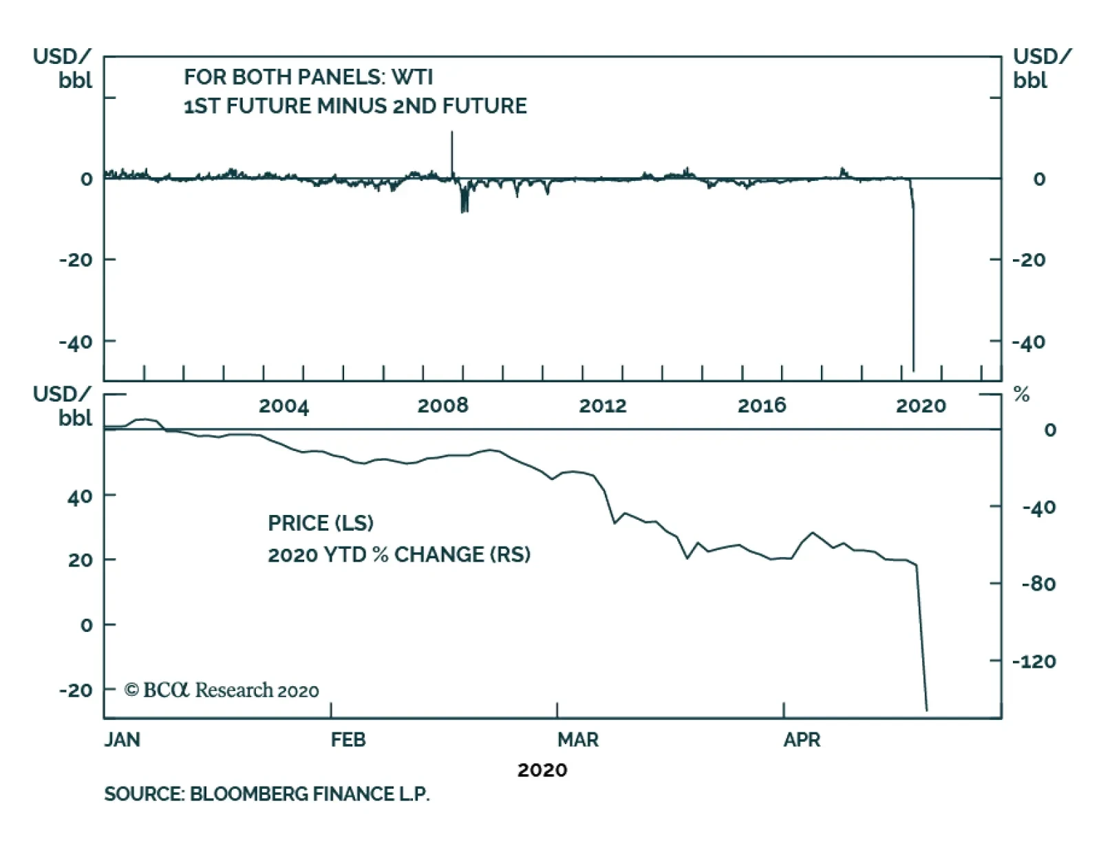 WTI crude oil delivered to Cushing in May 2020 is trading below $0.00/bbl as this note is typed, and falling fast (Chart 1). This is an historical print. WTI for June delivery is trading at ~ $22.00/bbl. What we are observing is the last of the May 2020…