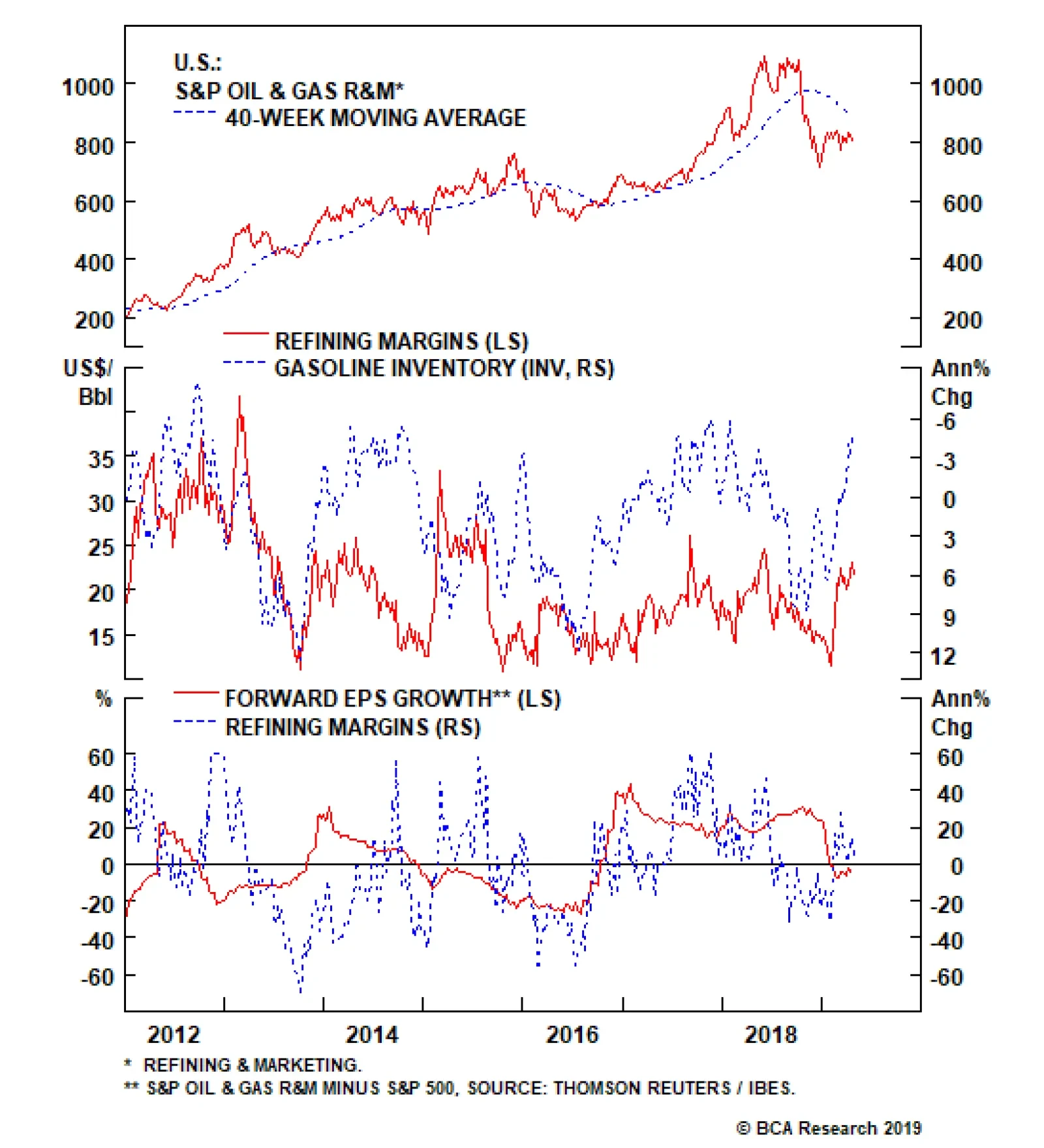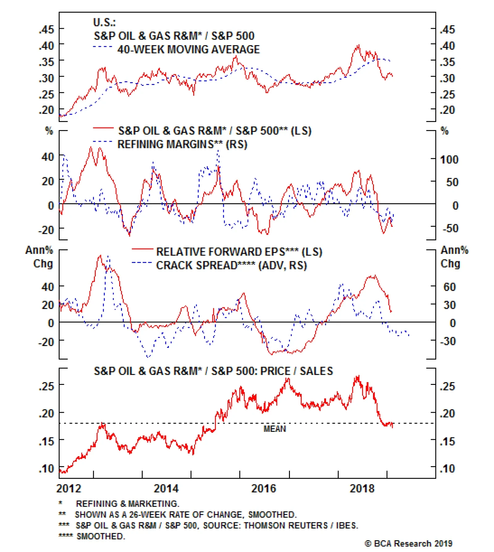 Underweight The S&P oil & gas refining & marketing index has typically performed in line with their profitability (second panel); the absolute price of inputs and outputs are far less important than the spread…