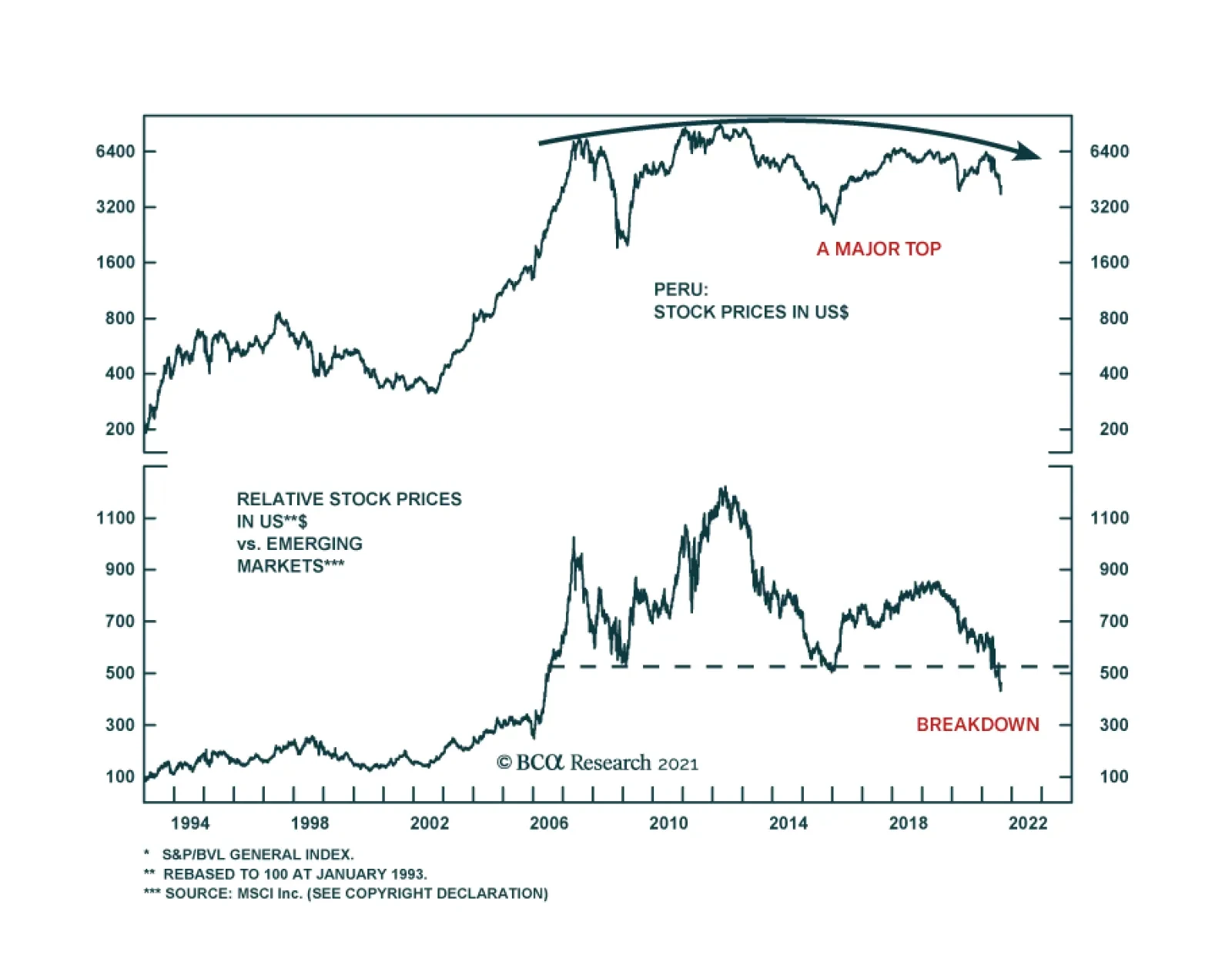 Chart 1Rising Metals Prices Have Failed To Boost Peruvian Equities Despite high precious and industrial metals prices, the Peruvian bourse has struggled in absolute terms and has also massively underperformed the EM equity…