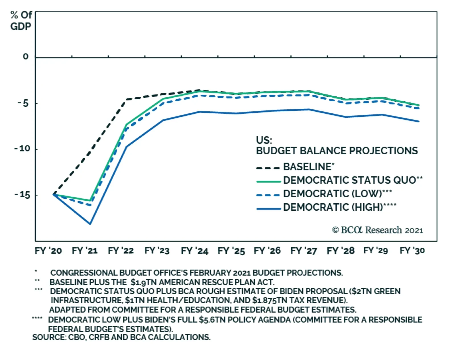 Our updated budget projections show that the decline of stimulus spending will be gradual in the coming years if Biden delivers his second reconciliation bill for FY2022 (Chart 3). Major changes from previous versions have to do with changes to the Congressional Budget Office’s baseline outlook. Our new Democratic Low Spending scenario assumes a $2 trillion dollar green/infrastructure package, a $1 trillion health care reform, and a roughly $2 trillion increase in tax revenue. The Democrats will raise taxes – at least partially repealing Trump’s Tax Cut and Jobs Act and raising a few other taxes. We expect the market to be negatively surprised by the magnitude of tax hikes, at least initially, though the upside risk to the equity market is that tax hikes will be watered down by moderate Democrats in the Senate. We would not bet on a positive tax surprise because even moderate Democrats are in favor of taxing corporations and the wealthy, the taxes can be phased in over a 10-year period, and the economy is on a cyclical upswing combined with mammoth new spending programs. Chart 3US Budget Deficit Booms Under Biden
