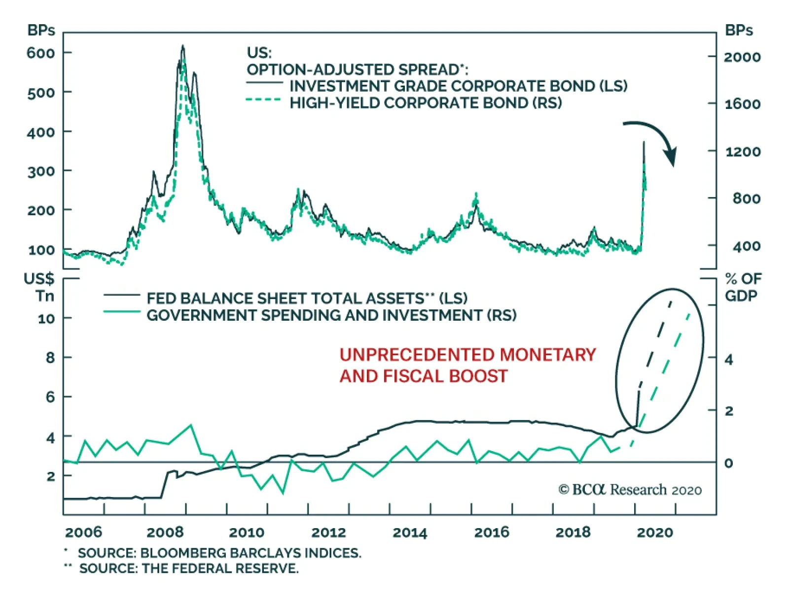 Highlights US Corporates: The Fed continues to expand the reach of its extraordinary monetary policies designed to combat the COVID-19 recession, now giving itself the ability to hold BB-rated US high-yield bonds within its corporate bond buying programs. Raise allocations to US BB-rated corporates to overweight, within a neutral overall strategic (6-12 months) allocation to US high-yield. Euro Area Corporates: European investment grade corporate debt has seen significant spread widening over the past month, but spreads have stabilized with the ECB introducing a new asset purchase program with fewer restrictions. Upgrade euro area investment grade corporates to neutral from underweight on both a tactical (0-6 months) and strategic (6-12 months) basis. Favor debt from beaten-up sectors that are already priced for severe economic weakness like Energy, Transportation and non-bank Financials. Central Banks Are A Corporate Bond Investor’s Best Friend Right Now Chart of the WeekThe Fed & ECB Are Supporting Bond Markets