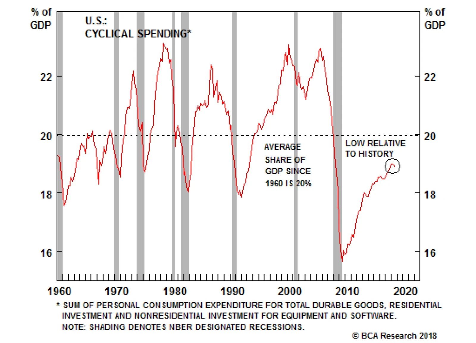 One of my favorite recession indicators is the percent of cyclical spending as a share of GDP. Cyclical spending includes corporate investment, residential investment, and consumer spending on durables. The chart above shows…