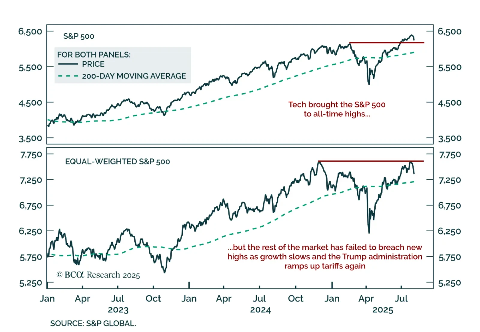 The S&P 500 recently breached new highs, but narrow leadership and a slowing labor market reinforce caution on risk assets. Equities rebounded from their post-Liberation Day lows, but the rally has been led mostly by the tech…