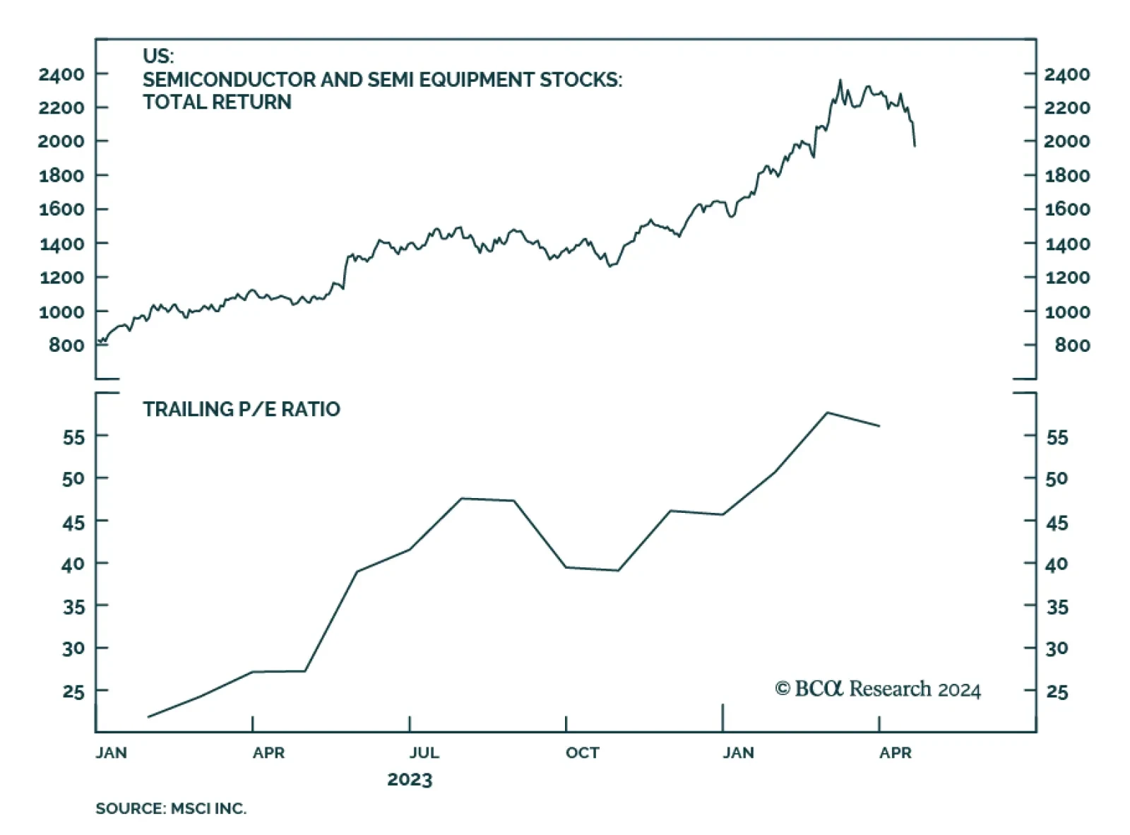 Global semiconductor stocks have returned 50% YTD in USD terms, and a whopping 200% since their September 2022 lows. However, they may have peaked back in July. Our Emerging Market strategists highlight a significant…