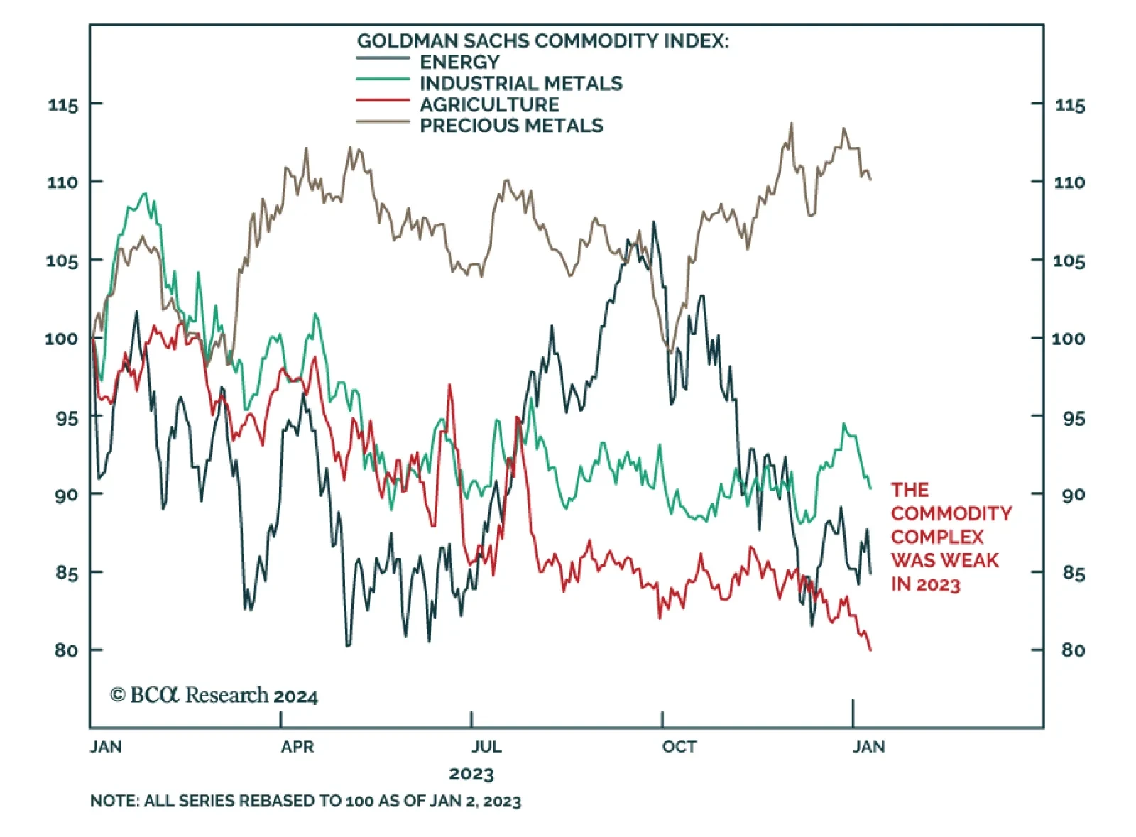 The commodity complex performed exceptionally poorly last year. Industrial metals and crude oil were among the few major financial assets we track that posted negative z-scores in 2023. Indeed, the 12% drop in the Golman Sachs…