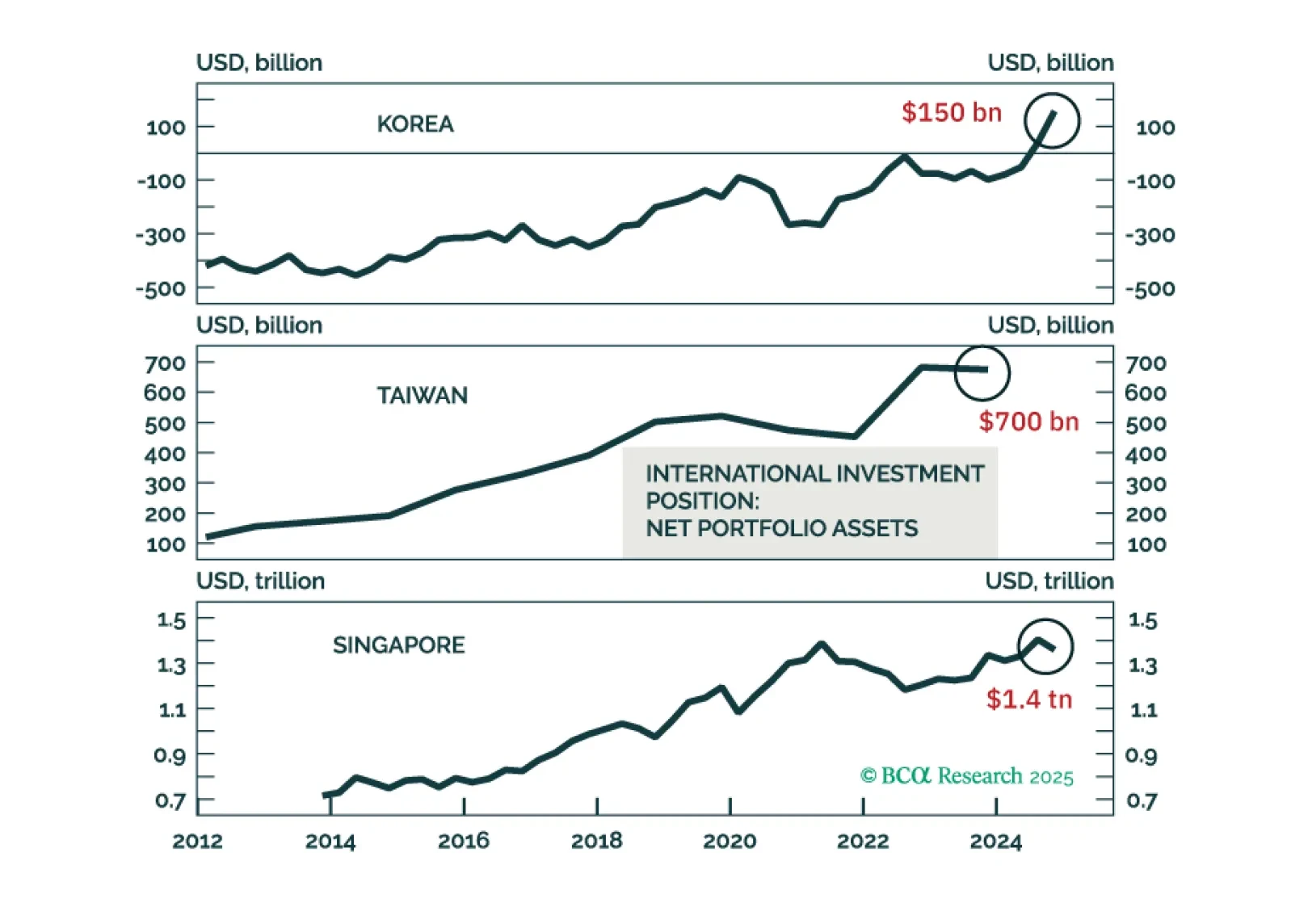 Taiwan, Singapore, and Korea's currencies might appreciate versus the USD, driven by capital repatriation from domestic private investors away from the US. This thesis is less pertinent to India, Indonesia, and the Philippines…