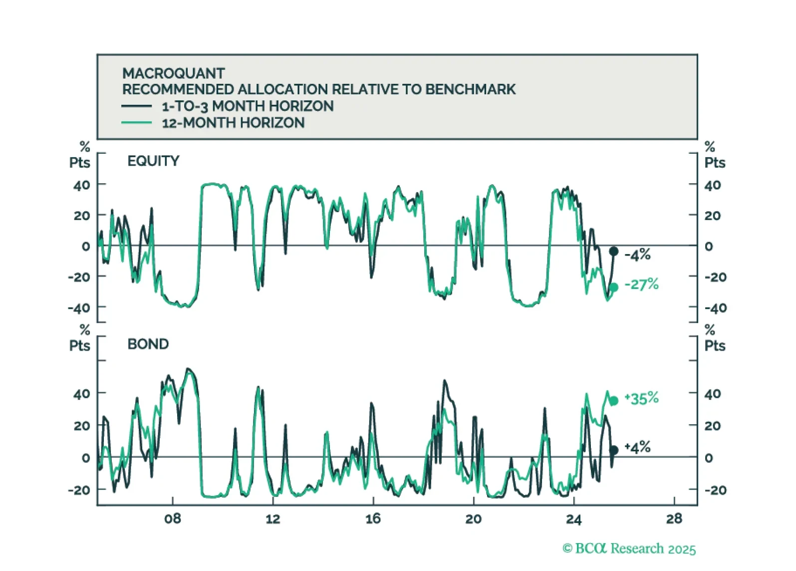 MacroQuant is tactically overweight equities, favors an above-benchmark duration stance in fixed-income portfolios, remains bearish on the US dollar, and is bullish on gold and copper.