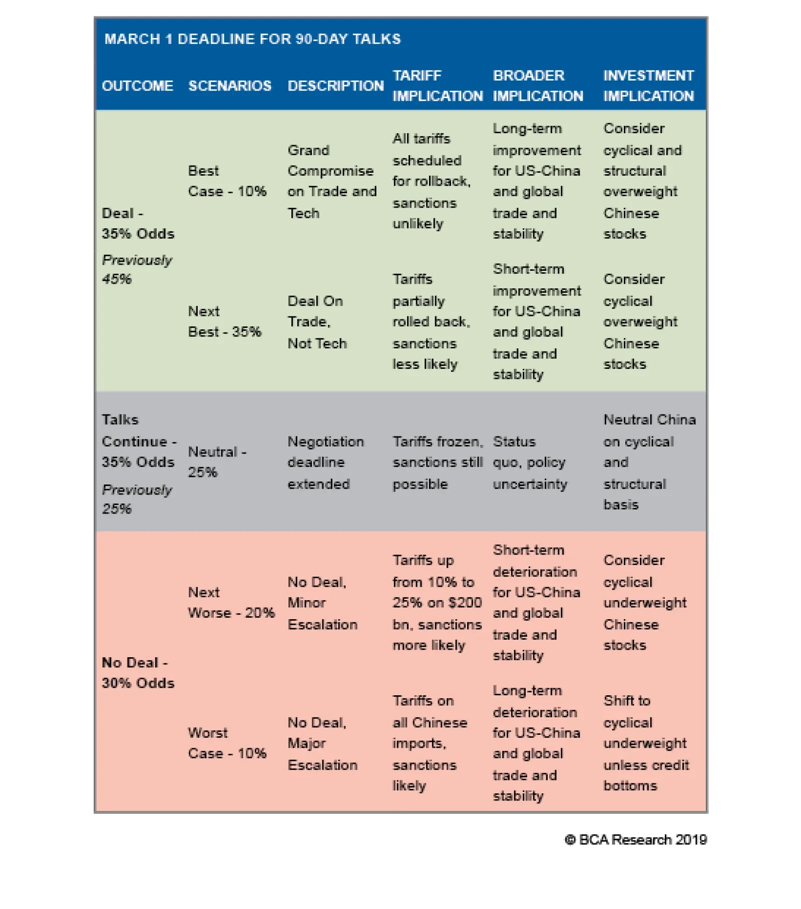 The above table presents our geopolitical strategists latest expectations of where the U.S. and China will be on March 1. We assign only 10% each to the “black and white” outcomes: a “Grand Compromise” or…