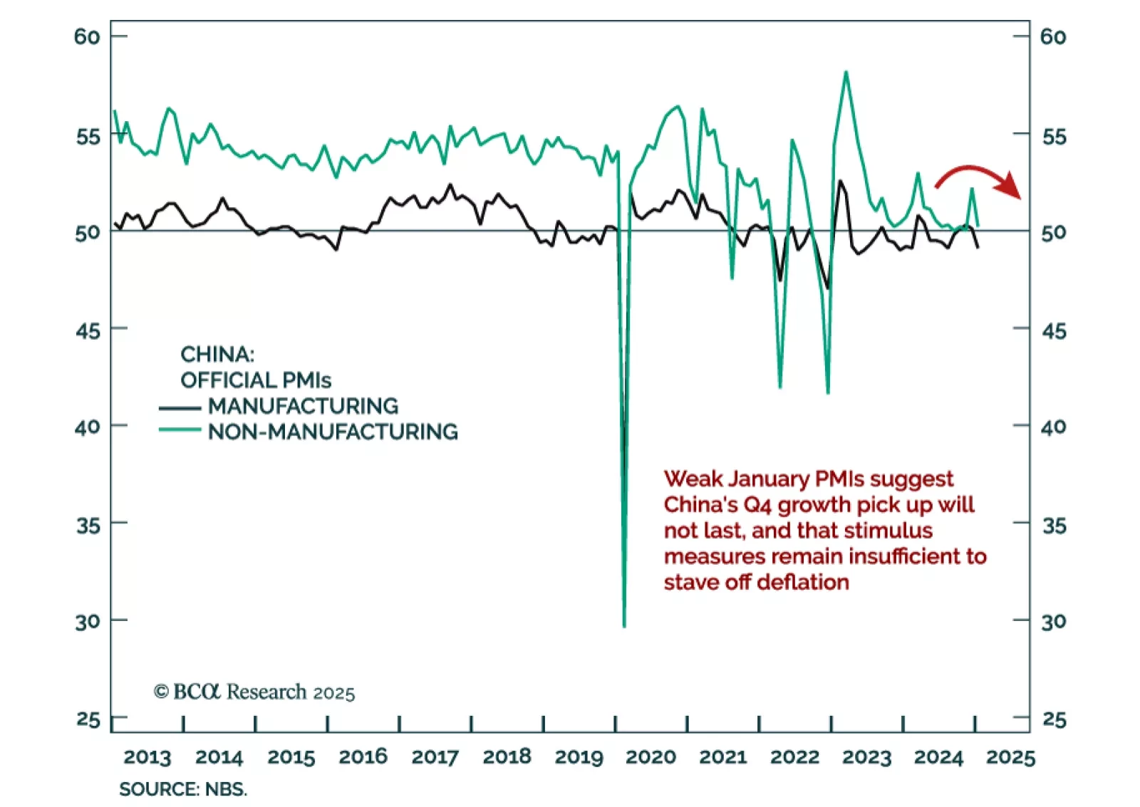 China’s official January PMIs disappointed, with the composite ticking down to 50.1 from 52.2. The decrease was driven by both the manufacturing and non-manufacturing components, with the former indicating contraction, and the latter…