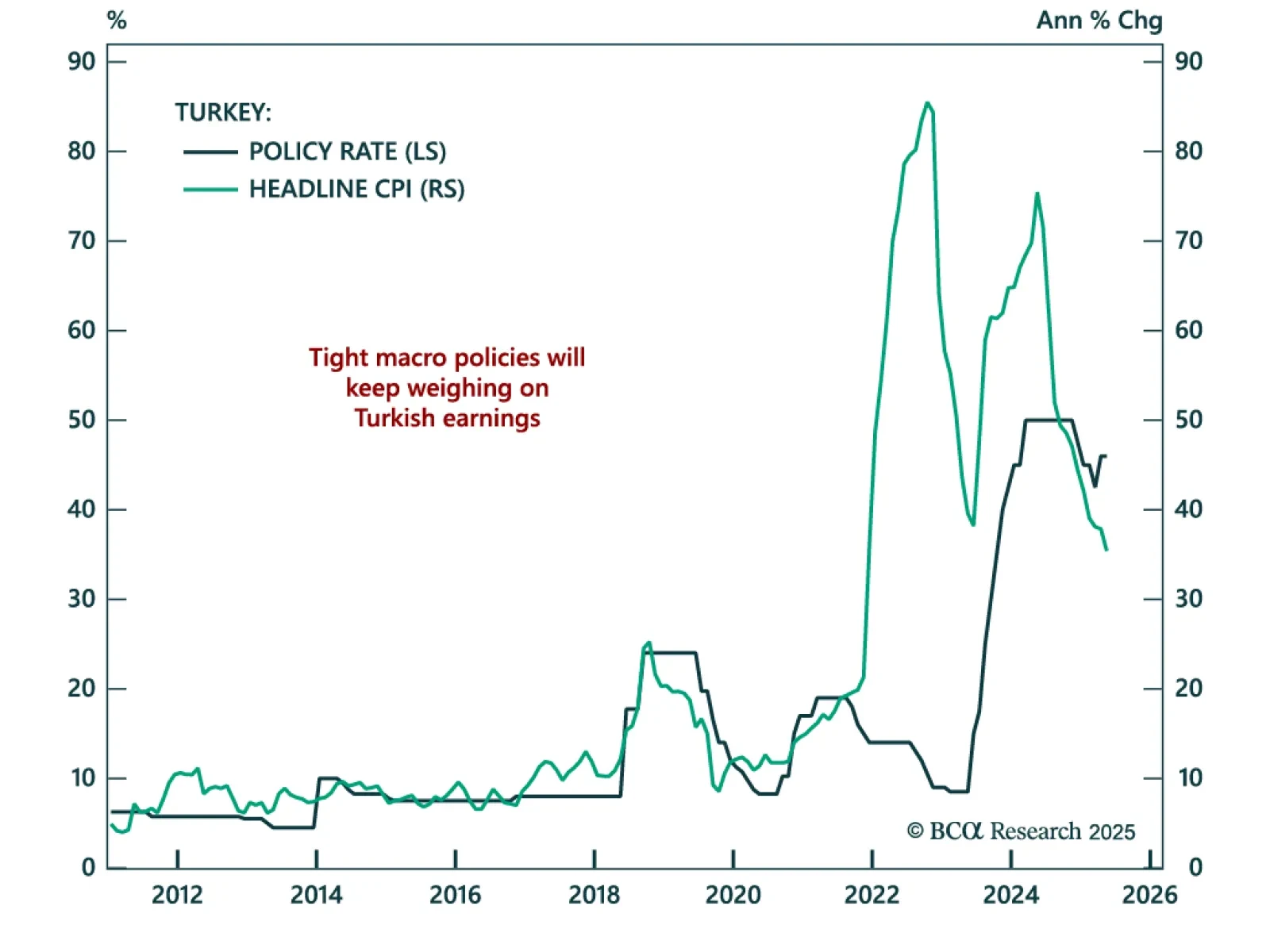 Turkey’s tight policy stance will weigh on growth and earnings, reinforcing our bearish view on Turkish equities. The central bank held rates at 46% and maintained a hawkish bias, consistent with efforts to bring inflation down from…