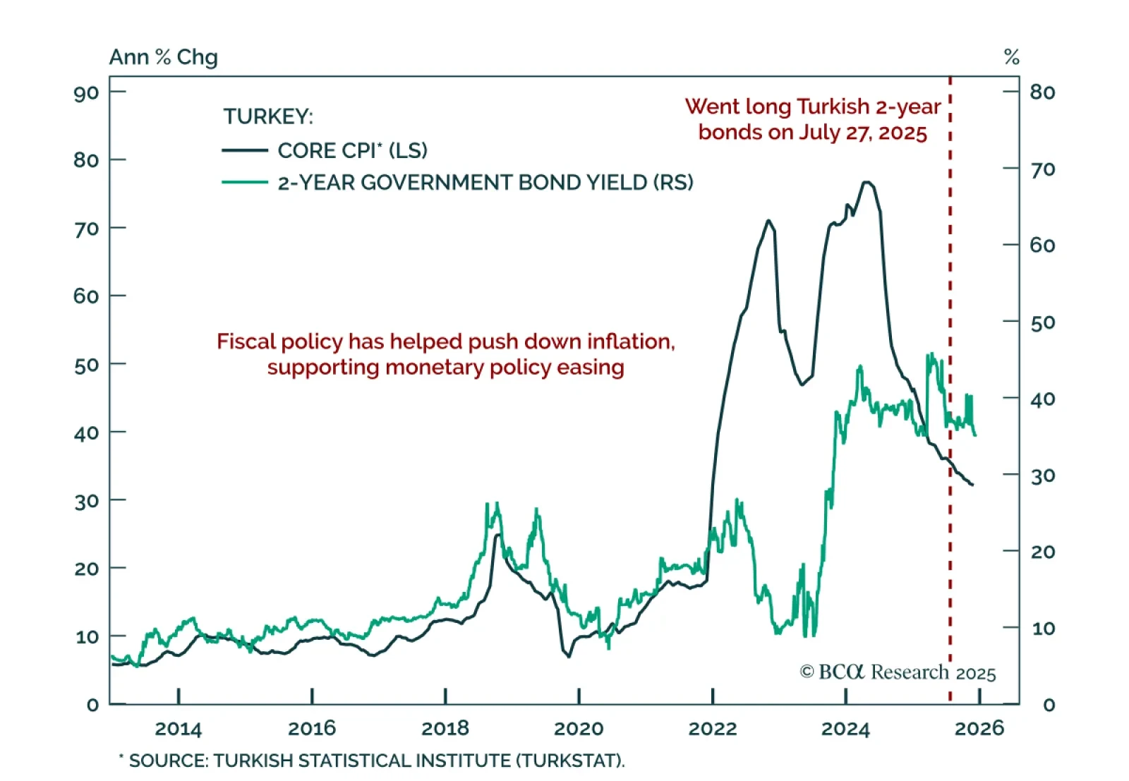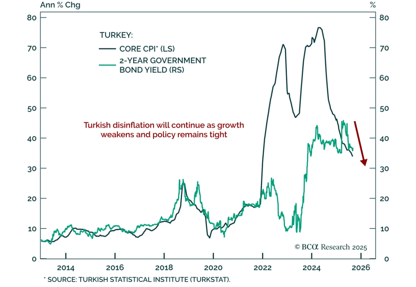 Thanks to the tight monetary and fiscal policies so far, inflation and growth are heading lower in Turkey. Buy 2-year local currency bonds, currency unhedged. Also, upgrade Turkey's domestic bonds from neutral to overweight and…