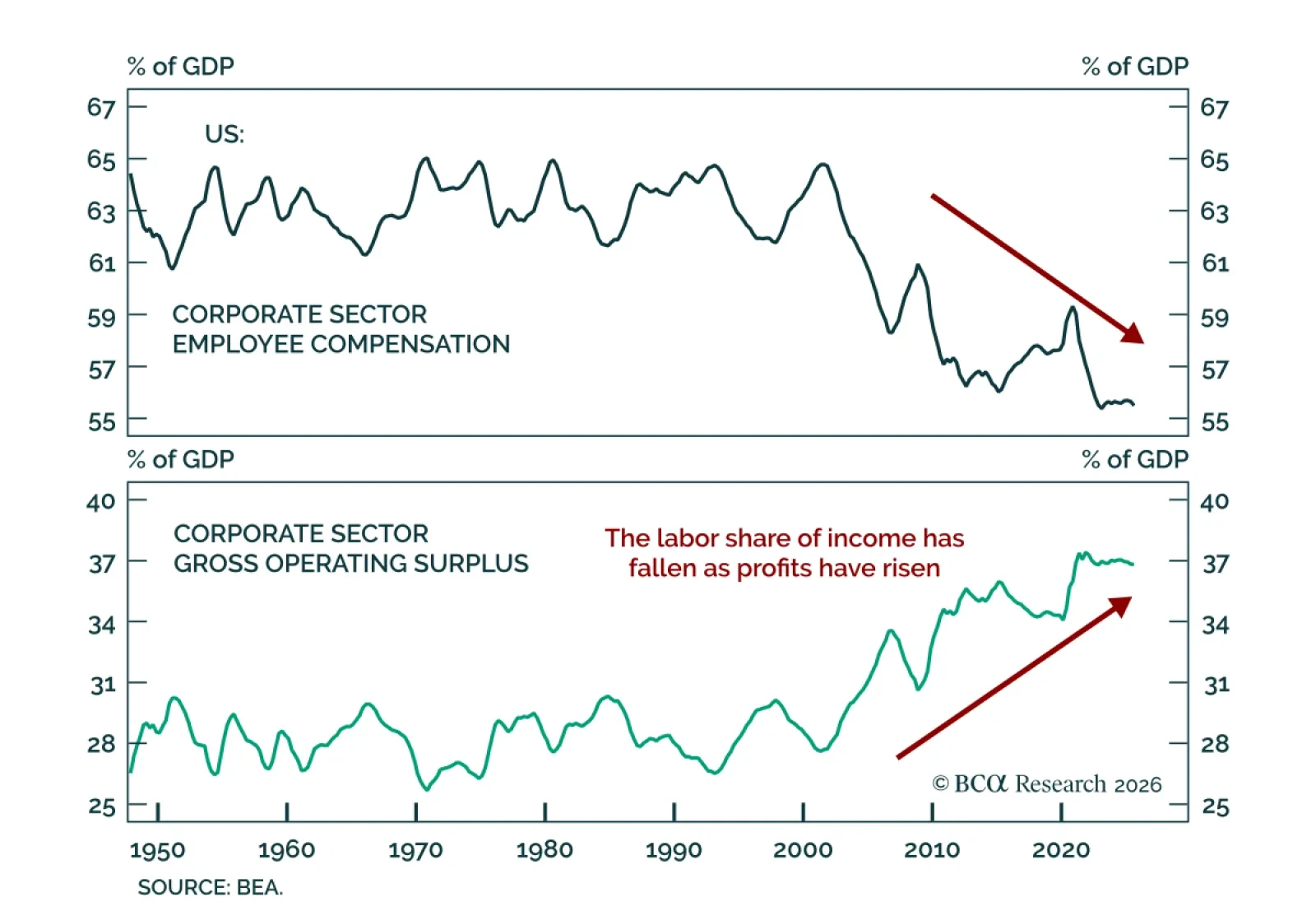 Political risk will increasingly weigh on US markets. Our Chart of the Week comes from Mathieu Savary, BCA’s Chief DM ex. US Strategist. Mathieu shows that US corporate-sector employee compensation has slipped to a post-war low as a…