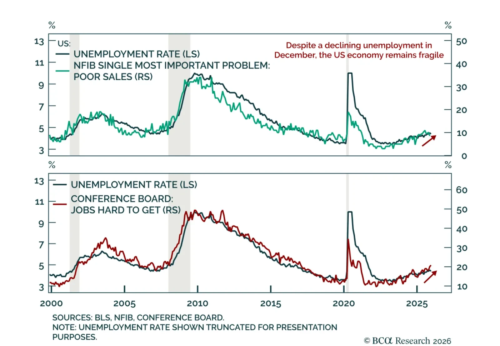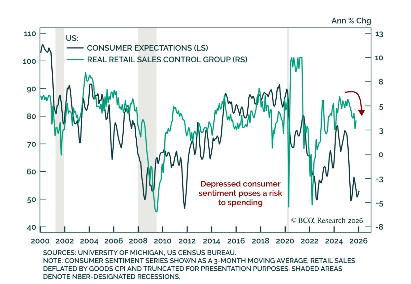 Maintain a conservative tactical stance as subdued sentiment and slowing labor dynamics pose risks to consumption. The preliminary January University of Michigan Consumer Sentiment Index slightly beat expectations, rising to 54.0…